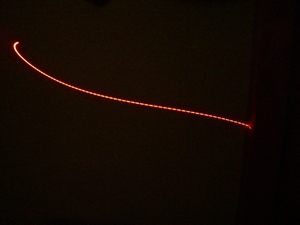●今回は緑色レーザーに引き続いてRLY-010NA-3による赤色レーザー(635nm)のパルス駆動実験をレポート致します。 今回入手した赤色レーザーは一般に復旧している650nm前後のレーザーと違い、635nmという人間の目で視認しやすいより波調の短い赤色レーザーです。友人が台湾旅行に行くと言うので頼みこんで買ってきてもらいました。 出力1mWの安価なレーザーポインターですが635nmのレーザーは国内では入手困難でしかも高価ことを考えると実験にはベストな選択だと思います。 前のレポートと同じようにRLY-010NA-3を市販のLEDライトに組み込みました。 今回はパルス駆動と連続駆動の違いが分かるようにレーザーの光跡をデジカメで撮影してみました。光跡が点の連続になっているのが見えると思いますが、これはRLY-010NA-3の回路によりレーザーを高速で点滅している証拠です。デューティー比率を変えることでこの点の長さが変化します。 写真でも分かると思いますが出力が同じ場合は635nmという赤色レーザーでも視認性というてんにおいては緑色レーザーにはかないません。 レーザーの法律規制により国内では1mWを超えるレーザーは販売されていませんが法改正前の在庫を1mWに制御して販売されていることもあり、ポインターについている定電流基板を外した際の実際のレーザーダイオードの定格出力は3mW前後だと思います。 |